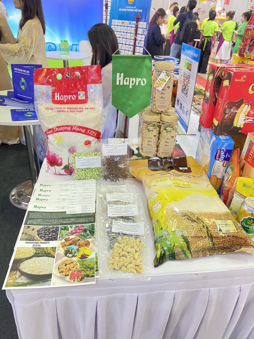 Tại Hội chợ, Hapro đã trưng bày các mặt hàng nông sản chủ lực như gạo, điều, cà phê, hạt tiêu, cơm dừa…và các mặt hàng thực phẩm chế biến như bún, miến, mỳ, đậu phộng, chuối sấy tại khu gian hàng Thương hiệu quốc gia và gian hàng riêng của Hapro.