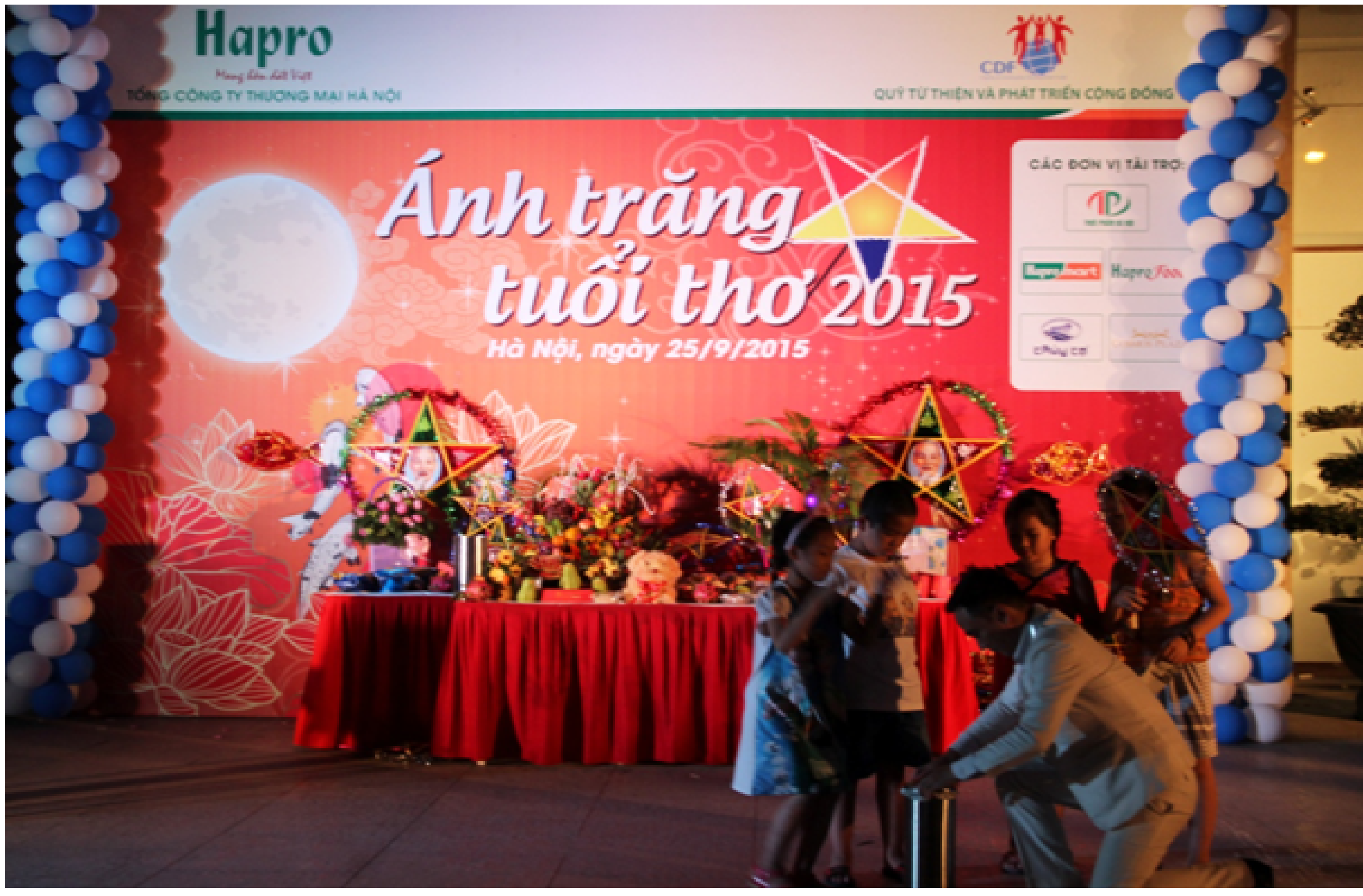 Tối 25.9.2015, các cháu thiếu nhi cùng bố mẹ là cán bộ, công nhân viên lao động đang làm việc tại Tổng công ty Thương mại Hà Nội – Hapro, các cháu nhỏ có hoàn cảnh khó khăn trên địa bàn phường Quốc Tử Giám đã có mặt tại sảnh Tòa nhà Hapro (phố Cát Linh, Hà Nội) để vui đón chương trình trung thu “Ánh trăng tuổi thơ 2015”. Đây là chương trình do Công đoàn TCT thương mại Hà Nội phối hợp với Quỹ từ thiện và phát triển cộng đồng TCT tổ chức hàng năm.