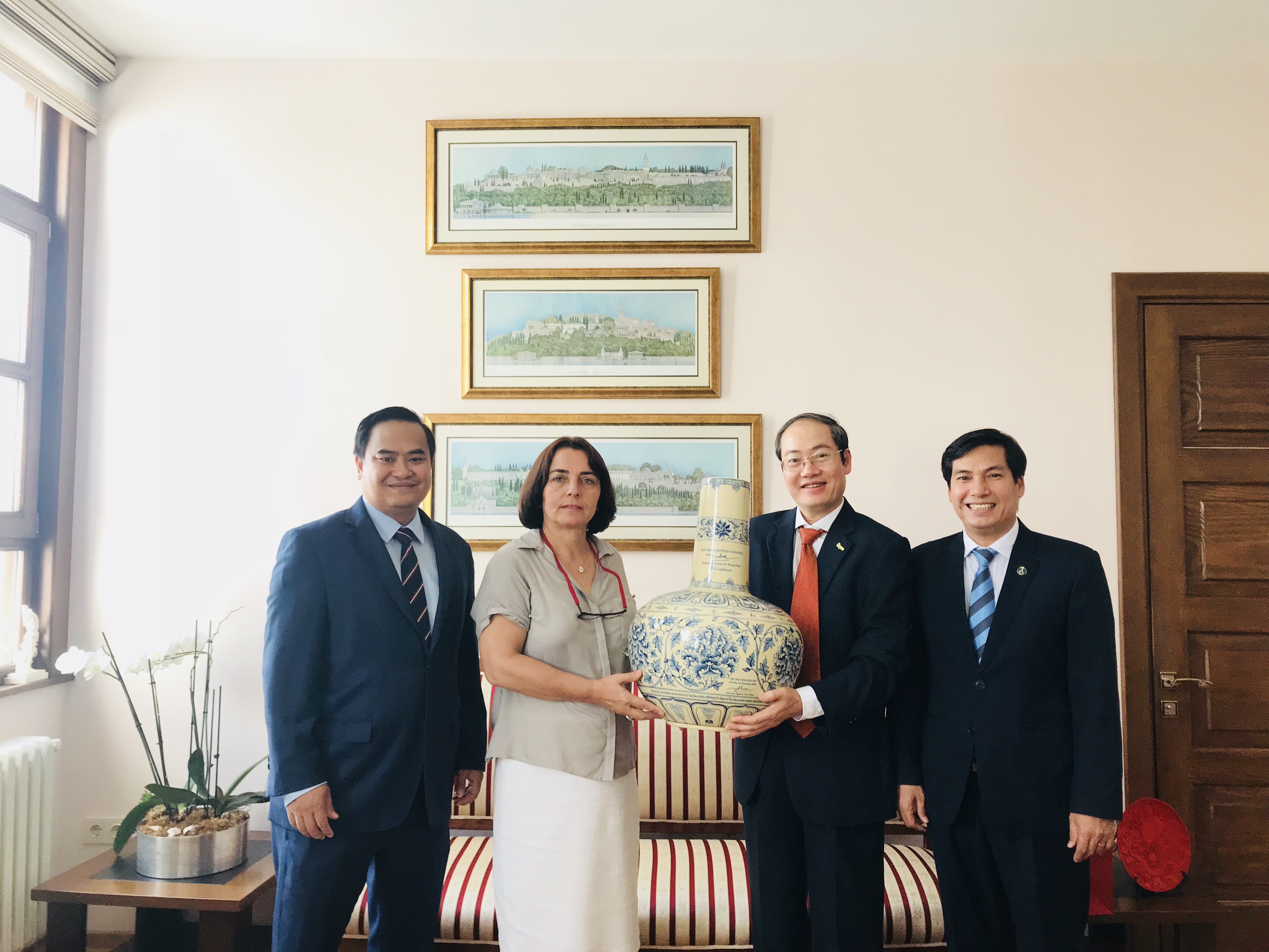 Tổng Giám đốc Hapro Vũ Thanh Sơn (thứ hai bên phải) và Giám đốc Công ty cổ phần Gốm Chu Đậu Nguyễn Hữu Thức (ngoài cùng bên phải) trao tặng Giám đốc Bảo tàng Topkapisaray, Thổ Nhĩ Kỳ bình gốm hoa lam Chu Đậu