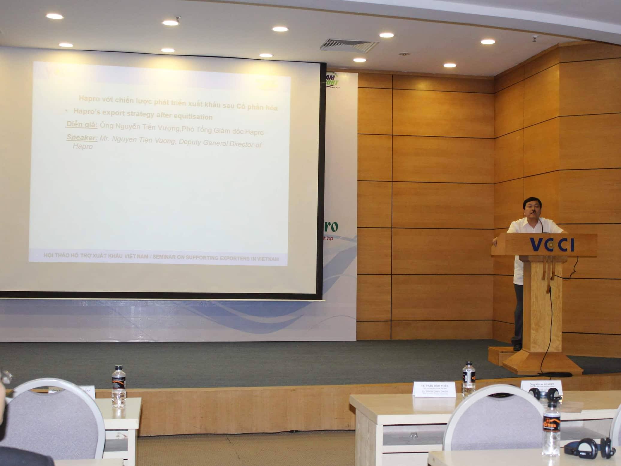 Ông Nguyễn Tiến Vượng – Phó Tổng giám đốc Hapro đã đại diện TCT tới tham dự và chia sẻ những kinh nghiệm thời gian qua Hapro đã định hướng và thực hiện nhằm đẩy mạnh, phát triển hoạt động xuất khẩu như: tiếp cận, mở rộng thị trường xuất khẩu lớn, có tiềm năng, tập trung đẩy mạnh các hoạt động xúc tiến thương mại; đầu tư xây dựng một số nhà máy chế biến, sản xuất các mặt hàng nông sản nhằm đáp ứng được những nhu cầu, tiêu chuẩn khắt khe của thị trường nước ngoài; nâng cao trình độ đội ngũ CBNV có chuyên môn nghiệp vụ cao để đáp ứng nhu cầu trong thời buổi hội nhập quốc tế…
