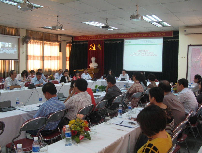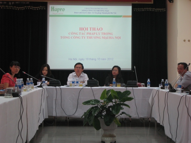 Ngày 19/10/2012 tại Hội trường tầng 7 – Văn phòng Tổng công ty Thương mại Hà Nội, Tổng công ty đã tổ chức Hội thảo chuyên đề: “Công tác pháp lý trong Tổng công ty Thương mại Hà Nội” với 2 điểm cầu tại Hà Nội và Thành phố Hồ Chí Minh. Tham dự Hội thảo có Đ/c Chu Xuân Kiên – Phó Tổng giám đốc TCT, Đ/c Nguyễn Thị Thu Hiền – Giám đốc điều hành – Chủ trì Hội thảo, Đ/c Nguyễn Anh Tuấn – Giám đốc Ban PLHĐ Tổng công ty, Đ/c Nguyễn Thúy Mơ – Phó Trưởng phòng Văn bản pháp quy – Sở Tư pháp Hà Nội, cùng các đồng chí lãnh đạo, cán bộ trực tiếp thực hiện công tác pháp chế của các Công ty thành viên, đơn vị trực thuộc Công ty mẹ – Tổng công ty, các cán bộ Sở Tư pháp.Trong khuôn khổ Hội thảo, Đ/c Nguyễn Thúy Mơ – Phó Trưởng phòng Văn bản pháp quy, đại diện Sở Tư pháp Hà Nội đã phổ biến một số nội dung cơ bản chủ trương, chính sách của Nhà Nước về công tác pháp lý doanh nghiệp và hỗ trợ pháp lý doanh nghiệp; Nghị định số 66/NĐ-CP của Chính phủ về Hỗ trợ pháp lý cho doanh nghiệp và nêu rõ nội dung Quyết định số 2706/QĐ-UBND của UBND Thành phố Hà Nội về việc ban hành kế hoạch hỗ trợ pháp lý cho doanh nghiệp trên địa bàn Thành phố Hà Nội giai đoạn 2011 – 2014 với mục đích nhằm tạo chuyển biến căn bản về nhận thức pháp lý, ý thức pháp luật và thới quen tuân thủ pháp luật của doanh nghiệp; tạo các điều kiện cần thiệt phục vụ hoạt động thực thi pháp luật, phòng chống rủi ro pháp lý, tăng cường năng lực cạnh tranh của doanh nghiệp và góp phần nâng cao công tác quản lý nhà nước bằng pháp luật đối với doanh nghiệp trên địa bàn thành phố Hà Nội, các hoạt động hỗ trợ pháp lý cụ thể: Xây dựng và khai thác cơ sở dữ liệu pháp luật phục vụ cho hoạt động của doanh nghiệp; Biên soạn nội dung theo chuyên đề và phổ biến văn bản quy phạm pháp luật liên quan đến doanh nghiệp; Hướng dẫn nghiệp vụ và bồi dưỡng kiến thức pháp luật cho cán bộ làm công tác pháp lý cho daonh nghiệp; Tiếp nhận kiến nghị và giải đáp pháp luật cho doanh nghiệp…