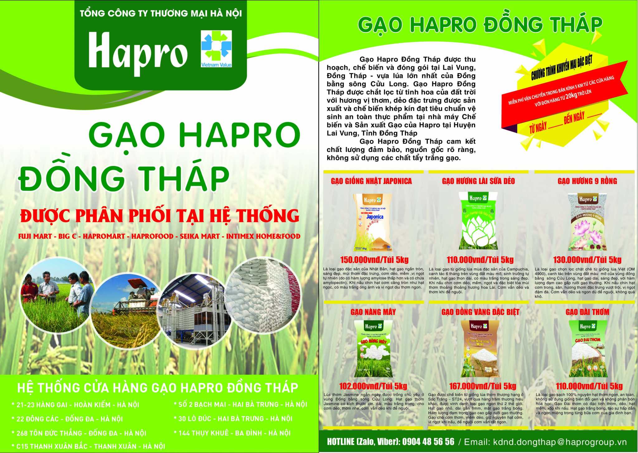 Xác định nông nghiệp là thế mạnh của quốc gia, dưới định hướng của Tập đoàn BRG, HĐQT và Madame Chủ tịch HĐQT Tổng công ty Thương mại Hà Nội, Hapro đã chủ trương tập trung đầu tư phát triển sản xuất gắn với một số sản phẩm nông nghiệp, điển hình là gạo. Hapro đã đầu tư Nhà máy gạo Đồng Tháp với công suất xay sát, chế biến xấp xỉ 100.000 tấn/năm. Các sản phẩm Gạo Hapro Đồng Tháp đã được xuất khẩu tới hơn 20 nước trên thế giới. Gạo Hapro Đồng Tháp đã được Cục quản lý Thực phẩm và Dược phẩm Mỹ cấp code xuất khẩu gạo vào thị trường Mỹ (FDA). Ngay sau đó, Hapro đã xuất khẩu thành công lô hàng gạo đầu tiên với 750 tấn vào thị trường “khó tính” này. Đến nay, Hapro đã bắt đầu triển khai đưa một số sản phẩm gạo đủ tiêu chuẩn xuất khẩu, đảm bảo vệ sinh ATTP ra thị trường nội địa với 06 sản phẩm gồm: gạo Đồng vàng; gạo Hương lài sữa dẻo; gạo Hương 9 rồng; gạo Nàng mây; gạo Đài thơm; gạo giống Nhật Japonica