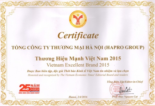 Kể từ ngày thành lập đến nay, thương hiệu Hapro đã 11 năm liên tiếp đạt giải thưởng uy tín này. Bà Nguyễn Thị Thu Hiền – Giám đốc điều hành Tổng công ty Thương mại Hà Nội đã vinh dự nhận giải thưởng “Thương hiệu mạnh Việt Nam 2015” từ BTC chương trình.