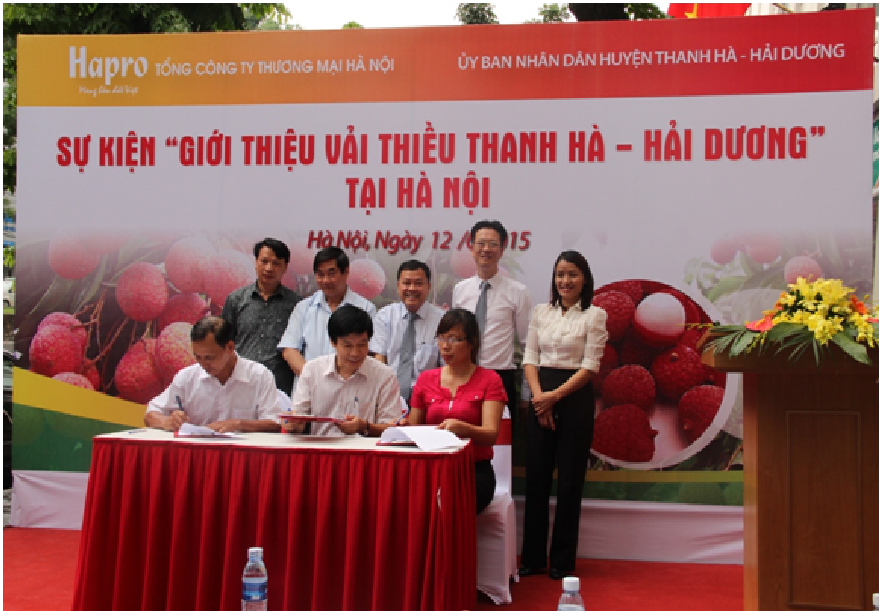 Lễ ký kết hợp đồng tiêu thụ Vải thiều Thanh Hà giữa đại diện Công ty CP phân phối Hapro và 2 hộ nông dân tại xã Thanh Hà tỉnh Hải Dương.