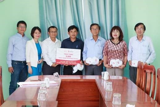 Đại diện Tập đoàn BRG trao tặng khẩu trang cho đại diện các trường học tại xã Bình Hải